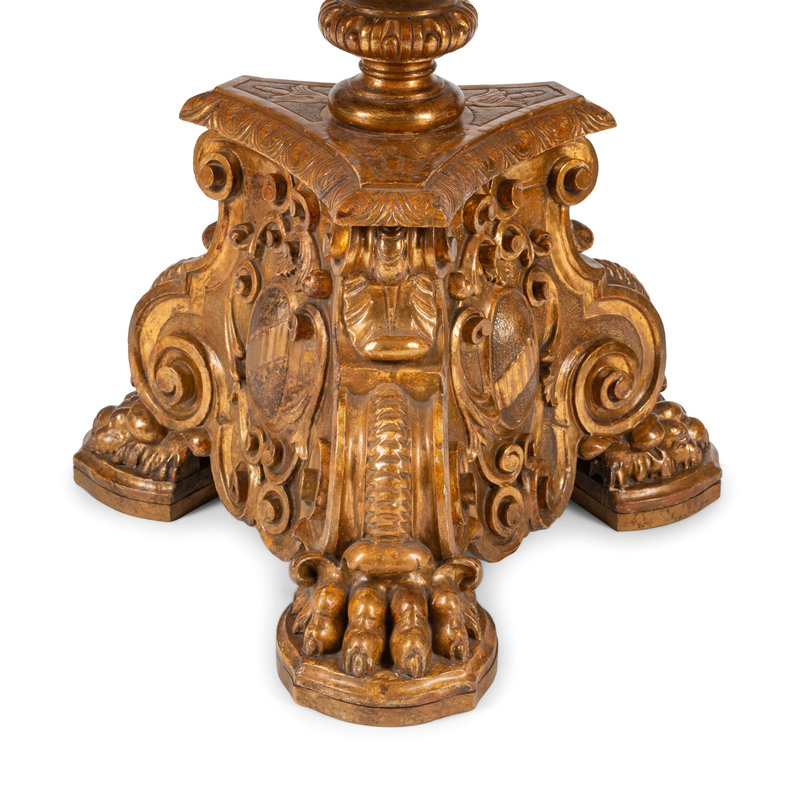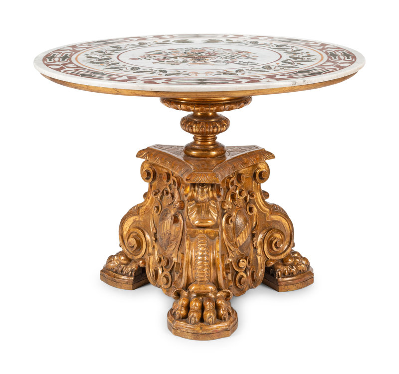 An Italian Baroque Style Giltwood Table Base with an Associated Scagliola Top