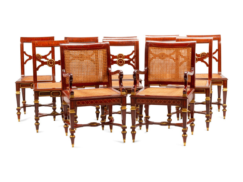 A Set of Ten Baltic Neoclassical Style Gilt Bronze Mounted Mahogany Dining Chairs