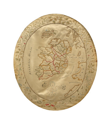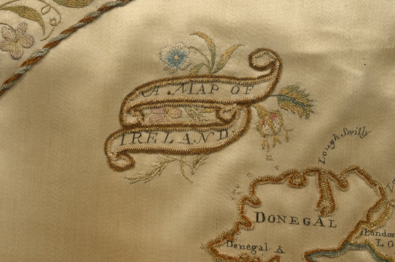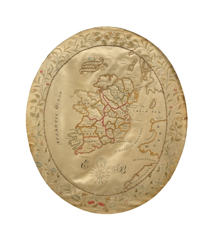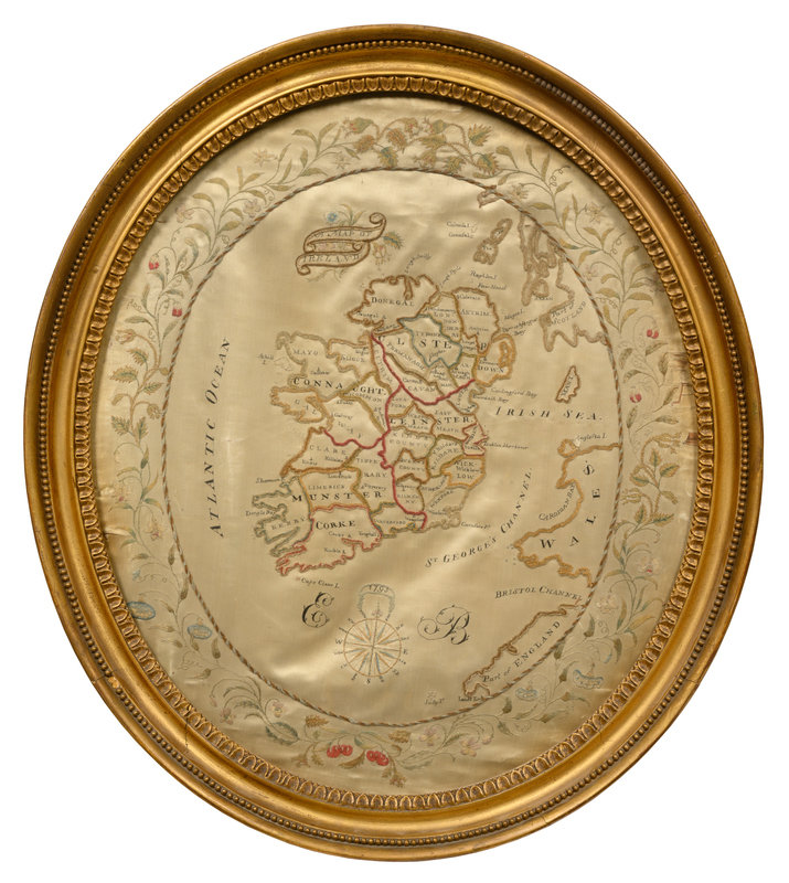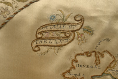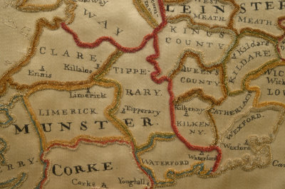 An Irish Embroidered and Chenille Decorated Map of Ireland on Silk