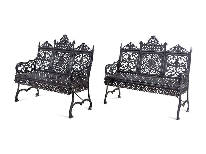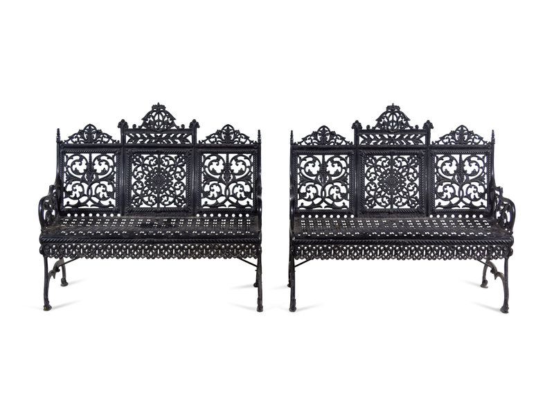 A Pair of American Gothic Revival Painted Cast Iron Garden Benches