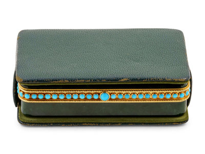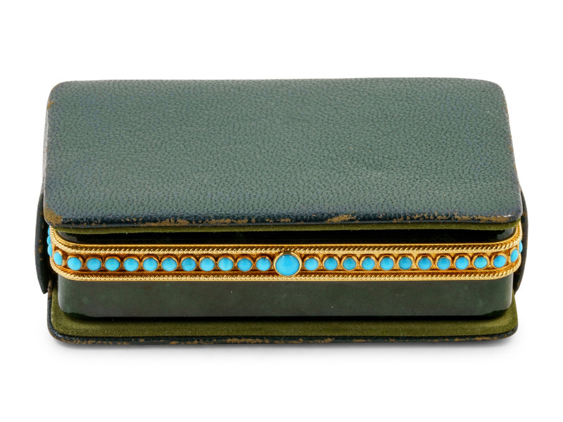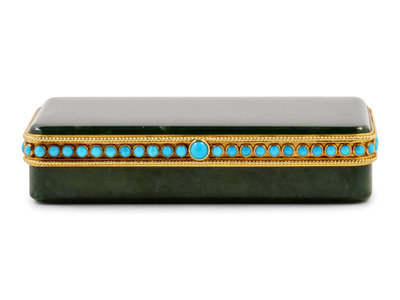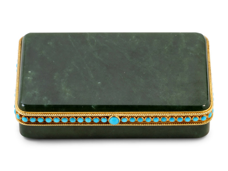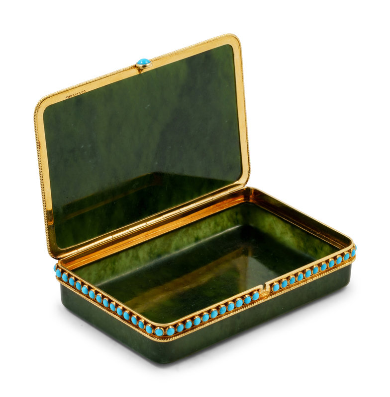 A Tiffany & Co. Carved Nephrite, Yellow-Gold and Turquoise Mounted Snuff Box
