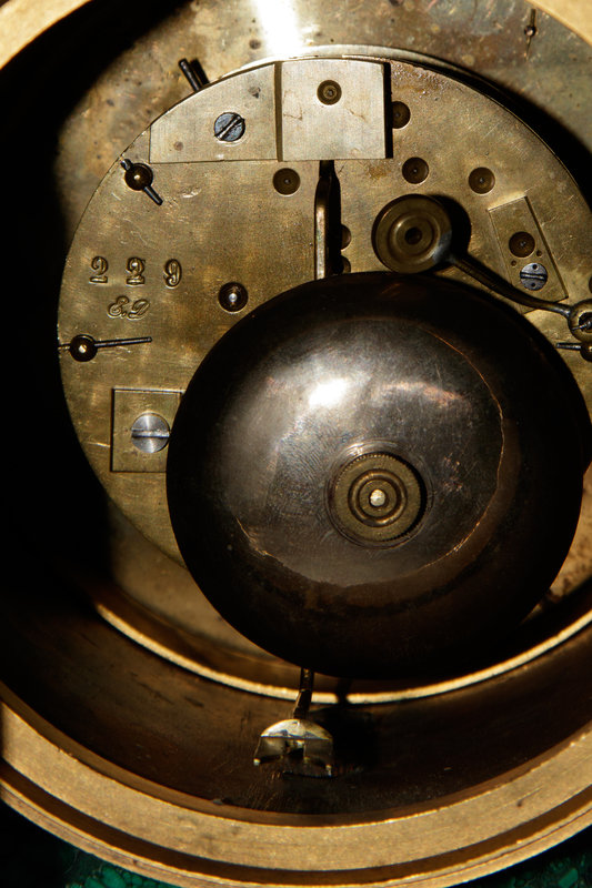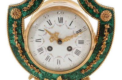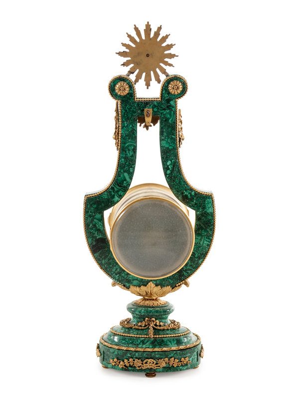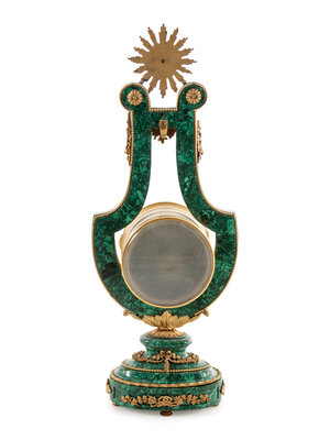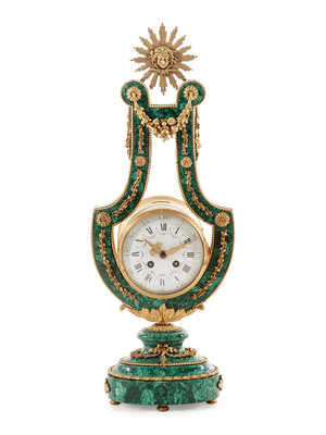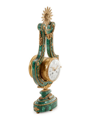 A Louis XIV Style Gilt Metal Mounted Malachite Veneered Harp Clock