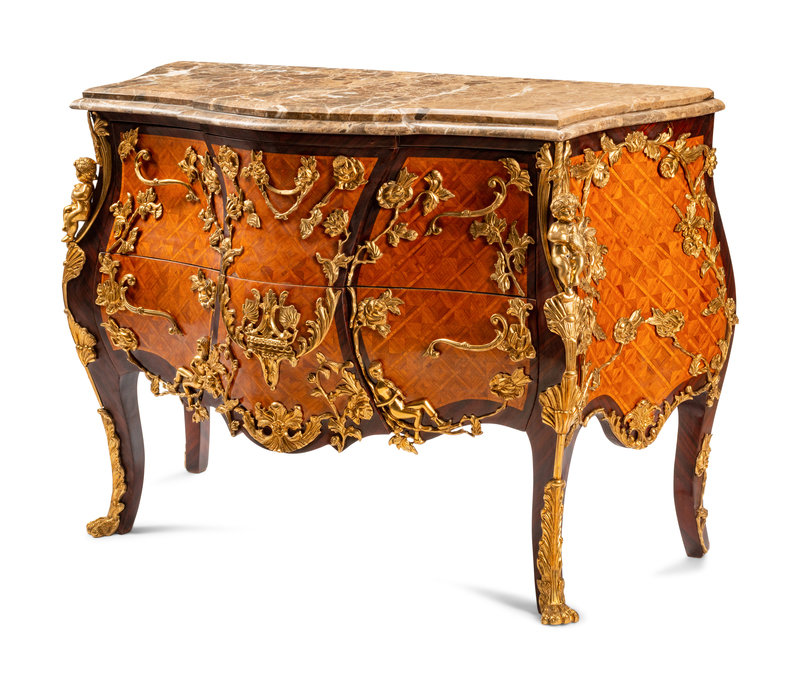 A Louis XV Style Gilt Bronze Mounted Parquetry Marble-Top Commode After the Model by Charles Cressent