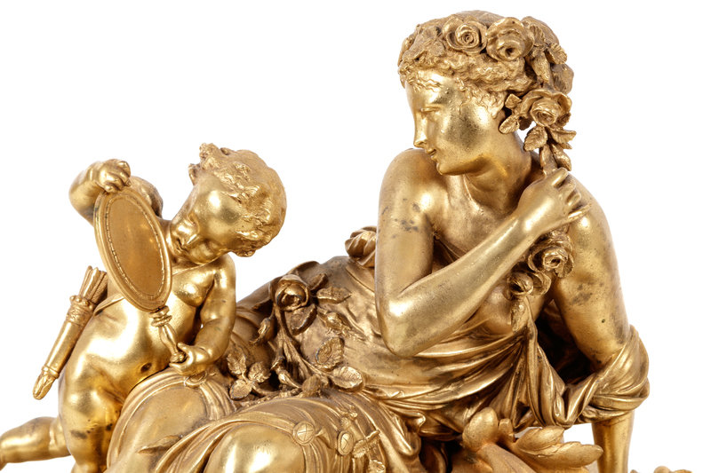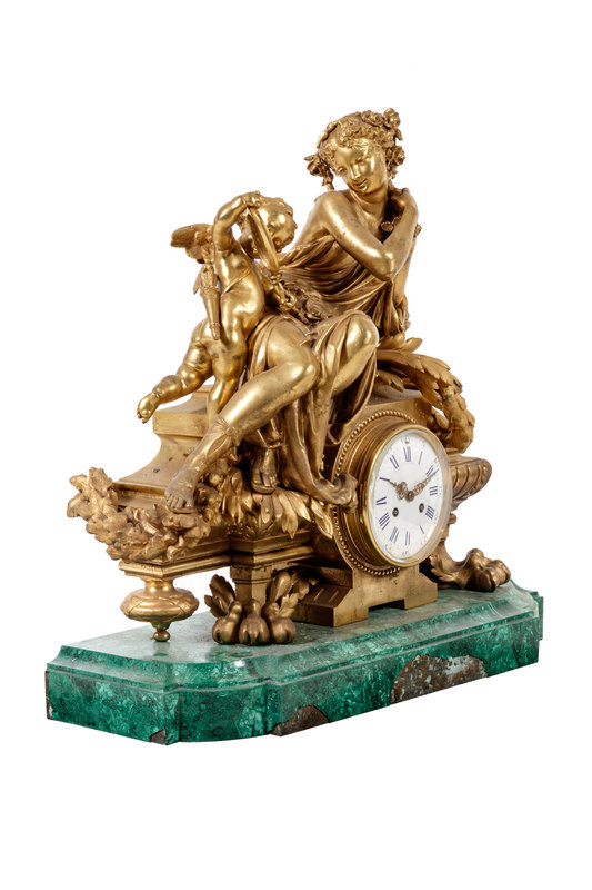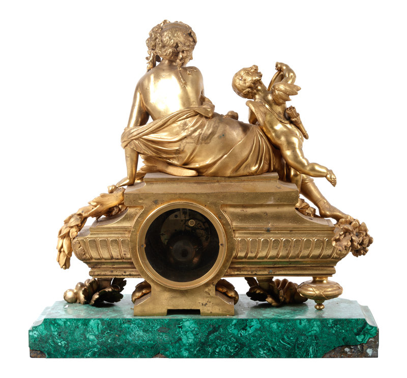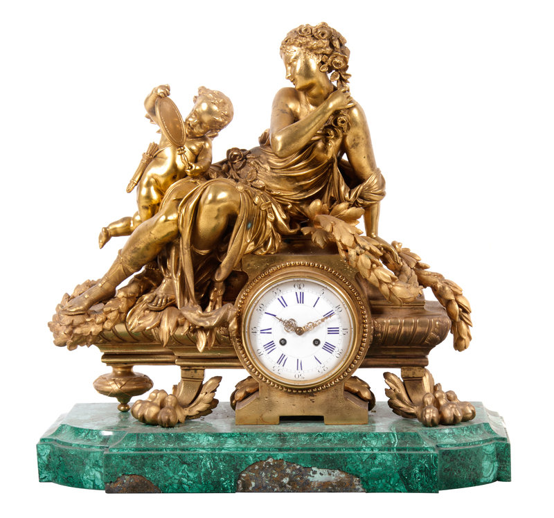 A Louis XV Style Gilt Metal Mounted Malachite Mantel Clock
