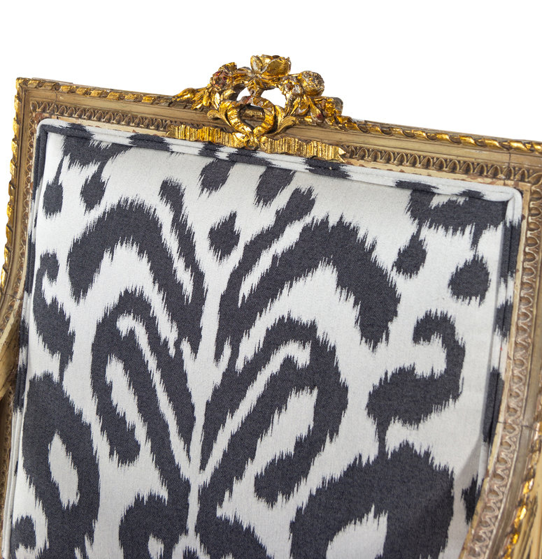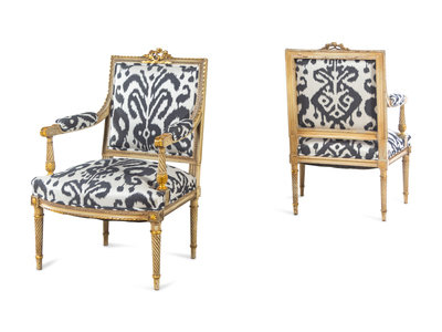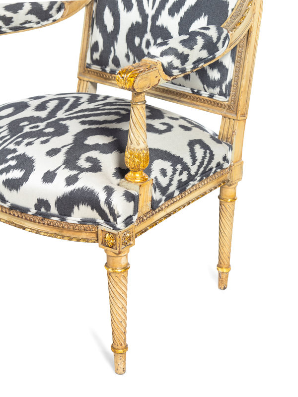 A Pair of Louis XVI Style Brunschwig & Fils Upholstered Cream-Painted and Parcel Gilt Fauteuils