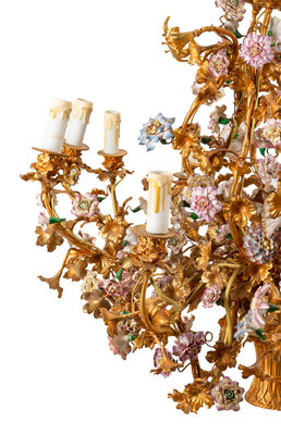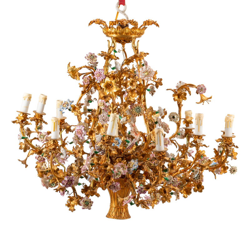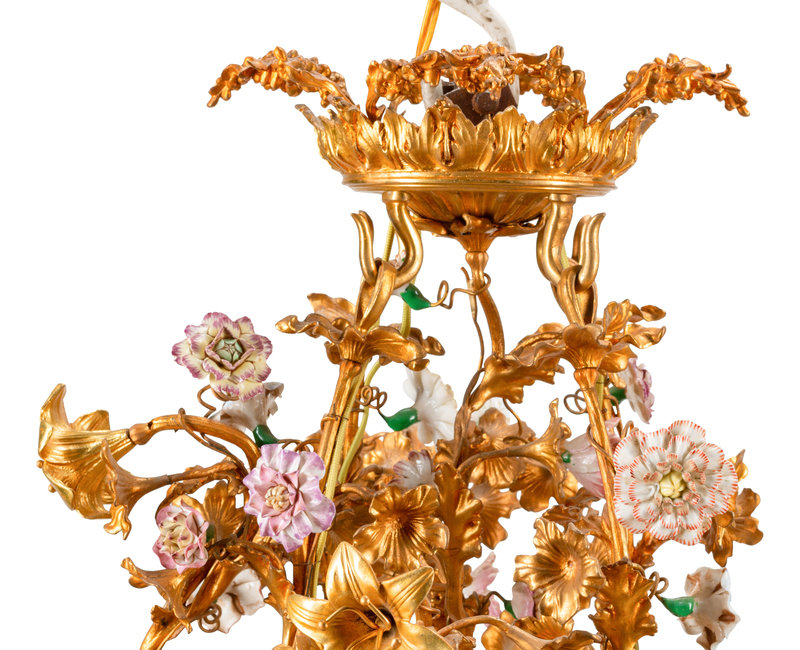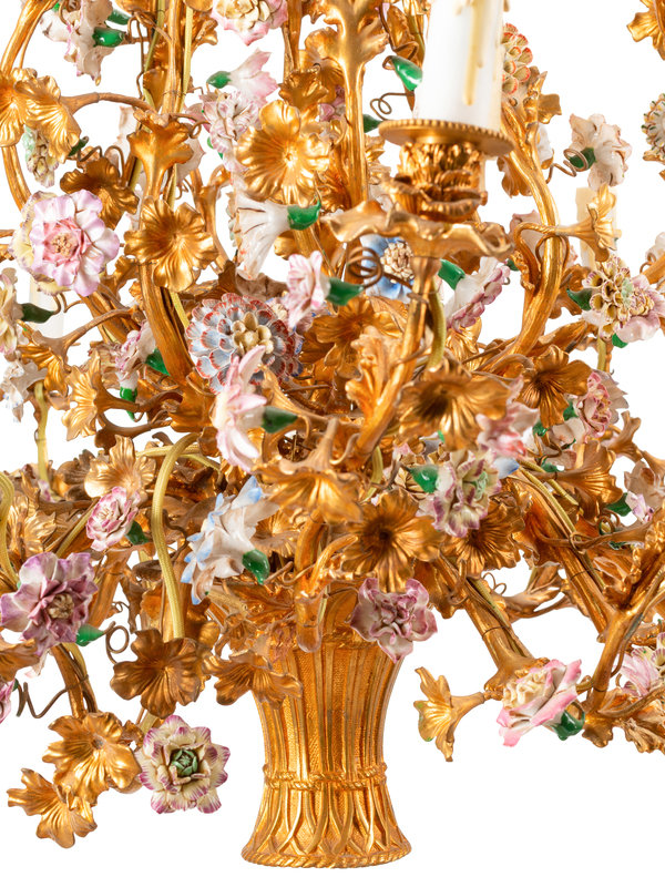 A Louis XV Style Gilt Bronze and Porcelain Basket-Form Chandelier