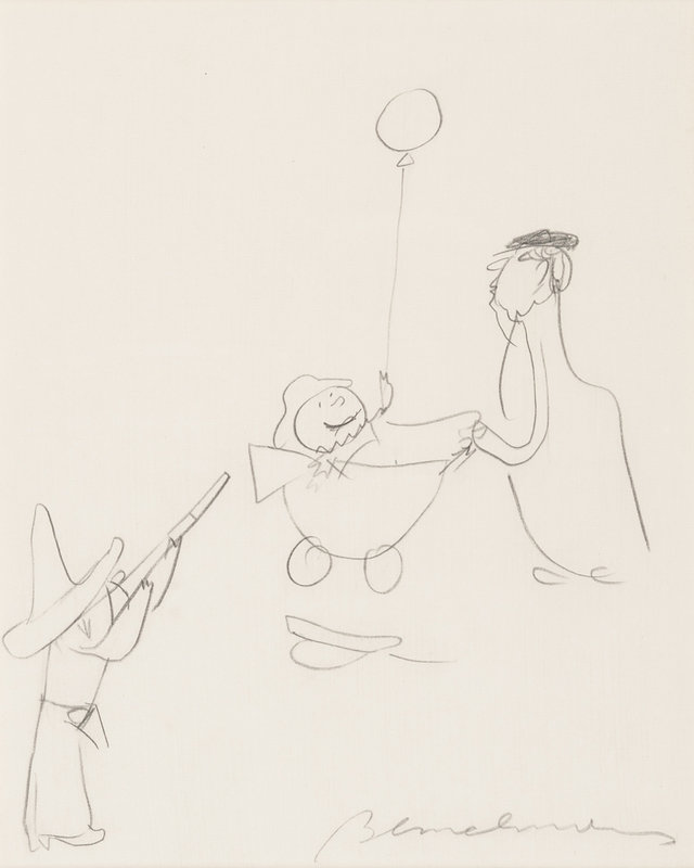 Pencil drawing on paper. 247 x 198 mm sight, matted and framed (unexamined out of frame). Showing a child (Pepito, the Spanish Ambassador's son?) shooting at a baby's balloon.
