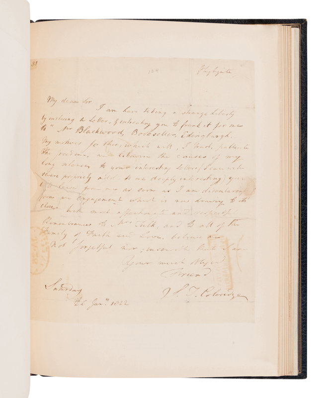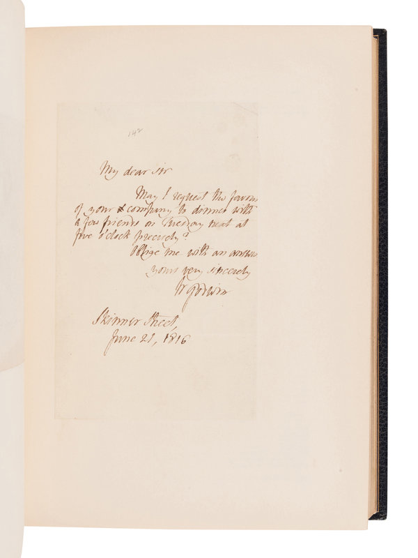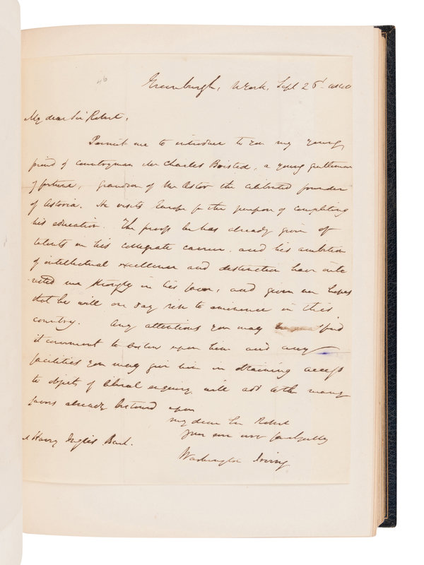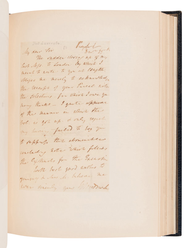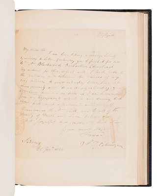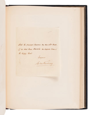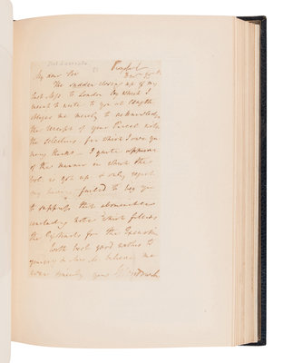 BROWNING, Robert. ALS, to Mrs. Benzon. N.d., 1p. -- COLERIDGE, Samuel Taylor. ALS, to C. A. Tulk. 26 Jan. 1822, 1p. -- DICKENS, Charles. ALS, to Henry Bicknell. 10 June 1858, 1p. -- DISRAELI, Benjamin. ALS, to an unnamed recipient. 23 May n.y., 1p. -- FARADAY, Michael. ALS, to an unnamed recipient. 15 July 1847, 1p. -- GODWIN, William. ALS, to an unnamed recipient, 21 June 1816, 1p. -- GOETHE, Johann Wolfgang von. ANS, to an unnamed recipient. 21 April 1878, 1p. -- HUNT, Leigh. ALS, to E. R. Moran. 5 Sept. n.y., 4pp. -- IRVING, Washington. ALS, to Robert Harvey. 26 Sept n.y., 1p. -- MITFORD, Mary Russell. ALS, to Mr. Belfe?. 26 Sept. 1826, 1p. -- NORTON, Caroline. ALS, to Mr. Hay. 14 Feb. 1853, 1p. -- SCOTT, Sir Walter. ALS, to Rosa. N.d., 1 1/2pp. -- SOUTHEY, Robert. ALS, to an unnamed recipient. 20 Aug. 1825, 1p. -- THACKERAY, William. AN. N.d., 1p. -- WORDSWORTH, William. ALS, to an unnamed recipient. 15 Dec.? n.y., 1p. -- (Complete list and details available on request).
