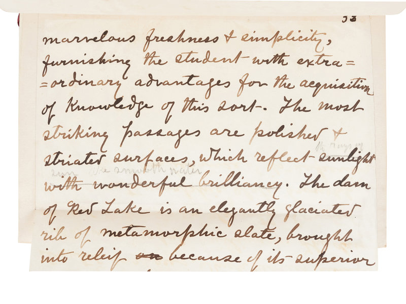 [Bound in to Volume I:] MUIR, John. Autograph manuscript, a page from the manuscript of The Mountains of California (1894). 1 page, 4to, (155 x 198 mm), in ink on paper with a few pencil corrections comprising 10 lines in ink, paginated "[35?]" at top. The text describes Bloody Cañon: "...marvelous freshness & simplicity, furnishing the student with extraordinary advantages for the acquisition of knowledge of this sort. The most striking passages are polished & triated surfaces, which reflect the rays of sun like smooth water. The dam of Red Lake is an elegantly glaciated rib of metamorphic slate, brought into relief because of its superior..." (Vol. 4, Chapter 5, "The Passes," p. 103 in this set).