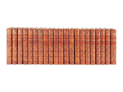 21 volumes, 8vo. Frontispieces. 20th-century mottled calf gilt, spines in 6 compartments with 5 raised bands gilt-lettered in one, floral gilt tool in rest, turn-ins gilt, red silk doublures, top edge gilt, others uncut (very slight rubbing to spines and corners).