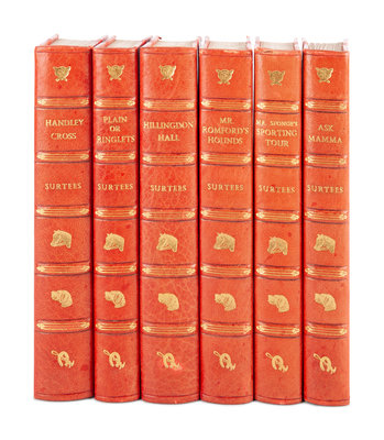6 volumes, 8vo (216 x 142 mm). Hand-colored engraved frontispieces and title-pages, engraved plates, numerous in-text woodcut illustrations by John Leech, H.K. Browne and W. T. Maud. Uniformly bound in 20th-century half red morocco gilt, spines in 6 compartments with 5 raised bands, gilt-lettered in two, the rest with central fox, horse, hound, horseshoe or riding crop tools gilt, top edges gilt, stamp-signed by Bayntun (some light rubbing, minor wear to spine ends).