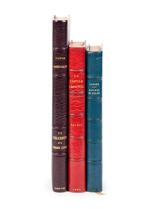 BARRUCAND, Victor. Le Chariot de Terre Cuite. Paris: L’Édition D’Art H. Piazza, [1921]. 4to. Binding stamp-signed by René Aussourd. LIMITED EDITION, number 79 of 135 copies on Japon Impérial of a total edition of 910 copies. -- HALÉVY, Ludovic. La Famille Cardinal. Paris: Librairie de L’Édition Nationale Émile Testard, editeur, 1893. 4to. Binding stamp signed by James MacDonald Co. LIMITED EDITION, one of 110 copies of the “Grande Luxe” edition. -- LONGUS. Daphnis et Chloé. Paris: Librairie Illustrée, J. Tallandier, Éditeur, 1890 (preface dated). Provenance: Louis V. Ledoux (signature). -- Together, 3 works in 3 volumes, various 4to and 8vo sizes, all in morocco or levant gilt, condition generally fine.