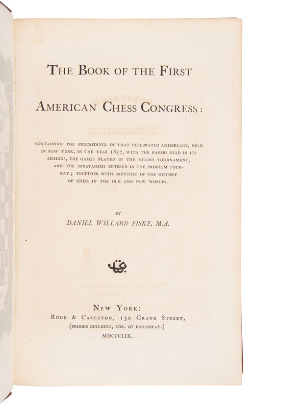 [CHESS]. FISKE, WILLARD DANIEL. The Book of the First American Chess Congress: containing the proceedings of that celebrated assemblage, held in New York, in the Year 1857… New York: Rudd & Carleton, 1859.