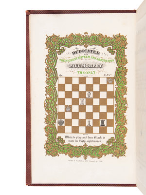 FIRST EDITION of the first American Chess Congress. The frontispiece is a dedication to Paul Morphy, the winner of the tournament. Includes 67 games in the Grand Tournament of 1857 held in New York, with Paul Morphy claiming the first prize. It also covers The Problem Tourney with 53 set-ups and their solutions in the back section of the book. A fine copy.