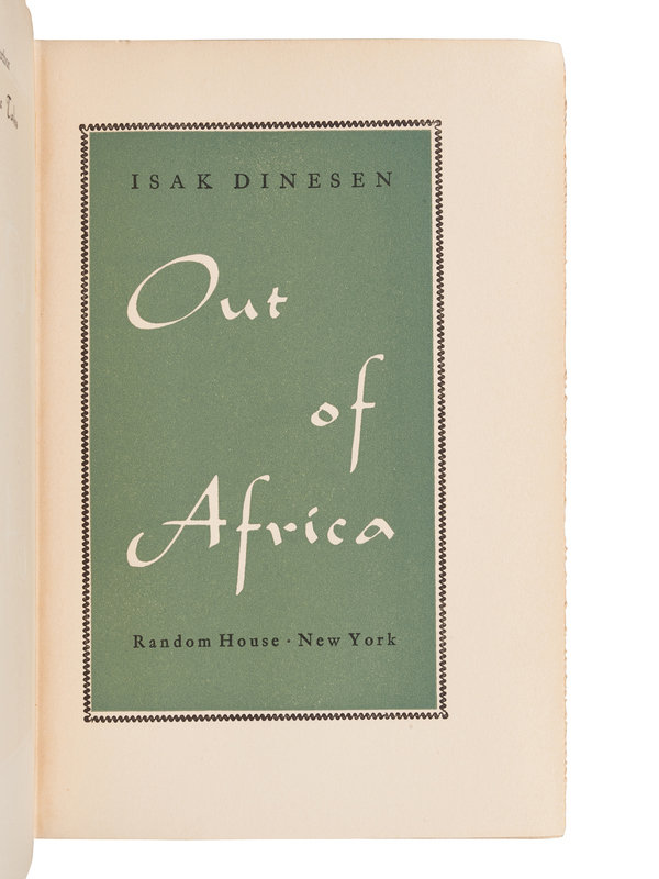 FIRST AMERICAN EDITION of Dinesen’s memoir recounting her 17 years in Kenya.