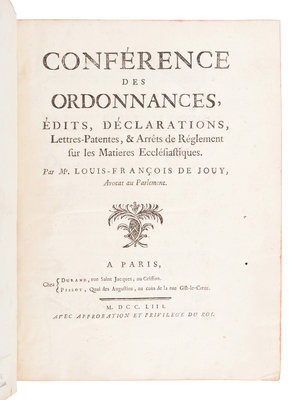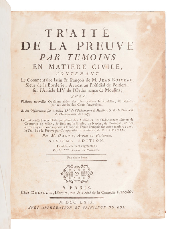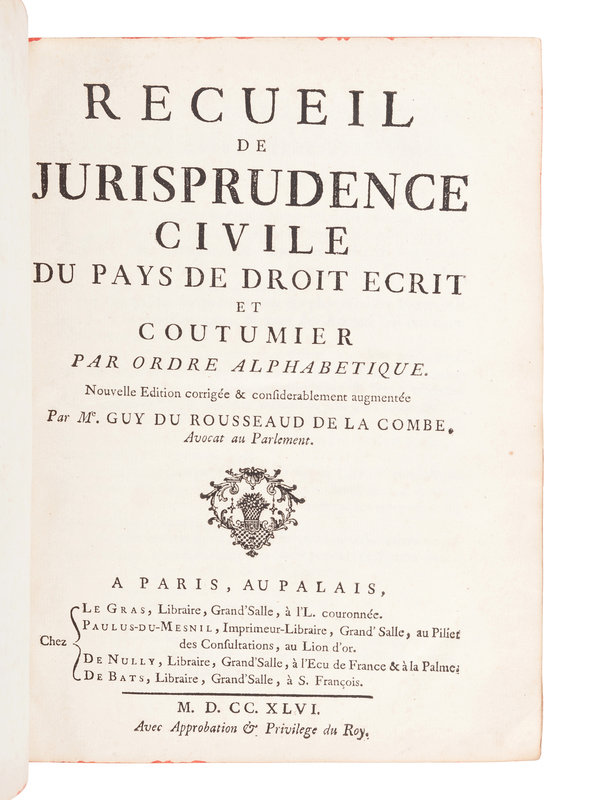 DU ROUSSEAUD DE LA COMBE, Guy. Recueil de Jurisprudence Civile du Pays de Droit Ecrit et coutumier par Ordre Alphabetique. Paris: Chez Le Gras, Paulus-du -Mesnil, De Nully, and De Bats, 1746. New revised edition. -- JOUY, Louis-François de. Conférence des Ordonnances, Édits, Déclarations...Paris: Chez Durand and Pissot, 1753. Later edition. -- DANTY, N. Traité de la Preuve par Temoins en Matiere Civile...Paris: Chez Celalain, 1769. Sixth edition. -- Together, 3 works in 3 volumes, 4to, all in contemporary mottled calf gilt (some light wear).