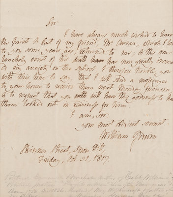 GODWIN, William (1756-1836). Autograph Letter Signed ("William Godwin"), to an unnamed recipient. Skinner Street, Snow Hill, 31 October 1817.