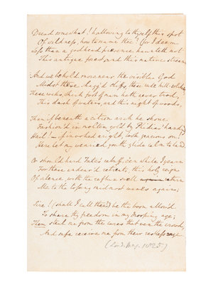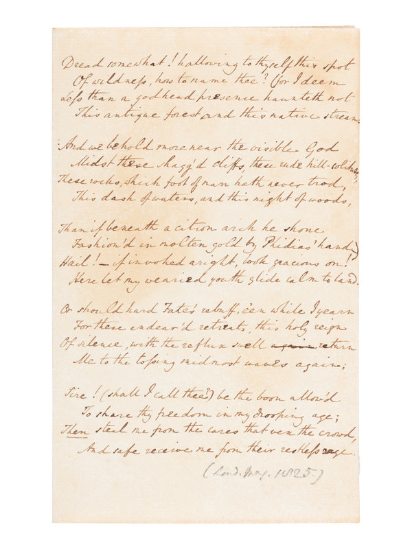 [Laid in:] Autograph manuscript, 19th-century, in an unknown hand. A fair copy of a translation of Thomas Gray's "Latin Ode on the Monastery of the Grande Chartreuse," first published unattributed in The London Magazine, Vol. I, January-April 1825, p. 367. The translation was later published in The Works of Charles and Mary Lamb, New York, G. P. Putnam's Sons, 1903, p. 382, with a note from the editor that the translation work is "not certain to be Lamb's, but probably his."