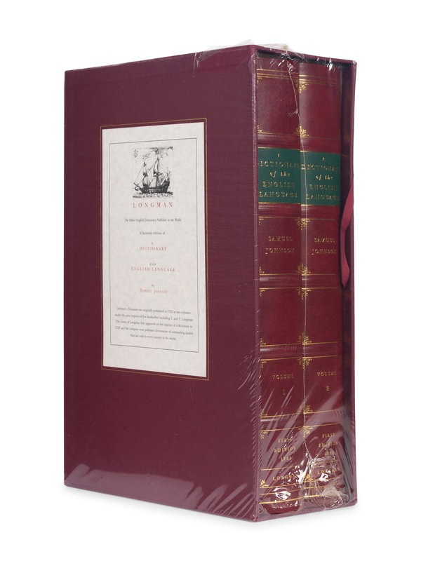 Facsimile edition of Johnson's Dictionary in two volumes, with two additional booklets as issued, comprising: a facsimile of the Plan of a Dictionary of the English Language by Johnson and a 16-page booklet with introductory essays. Johnson's Dictionary was originally published in 1755 under a joint imprint of five booksellers, including T. and T. Longman. AS NEW IN ORIGINAL SHRINKWRAP.