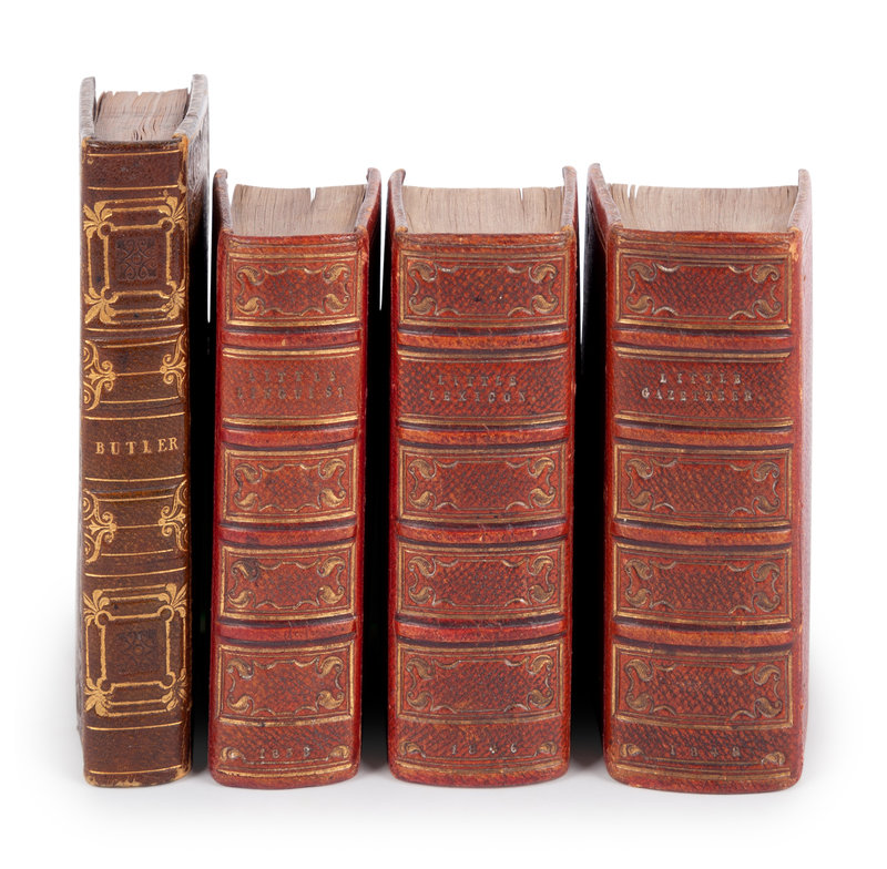 BUTLER, Samuel. Hudibras. London: by Jones & Company, 1824. -- The Miniature English Grammar. London: William Mason & Son, n.d. -- MAUNDER, Samuel. The Little Lexicon. London: T. Noble, 1846. Fifth edition. -- MAUNDER, Samuel. The Little Gazetteer. London: printed for the proprietor, n.d. -- Together, 4 works in 4 volumes, 48mo, engraved frontispiece and title-pages, all in contemporary gilt-decorated morocco, condition generally fine.