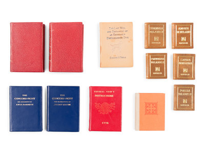O’Neill, Eugene. The Last Will and Testament of an Extremely Distinguished Dog. Worcester, MA: Achille J. St. Onge, 1972. Tan calf, edges gilt. LIMITED EDITION, one of 1,000 unnumbered copies. -- STEVENSON, Robert Louis. Prayers Written at Vailima. Los Angeles: Dawson’s Book Shop, 1973. LIMITED EDITION, one of 500 unnumbered copies. Original printed boards. -- [GAGE, Thomas]. General Gage’s Instructions. Oakham, MA: The Oakham Bindery, 1974. Red morocco gilt. LIMITED EDITION, one of 1,000 unnumbered copies. -- BARRETT, Amos. The Concord Fight. Concord, MA: Robert D. Naiva, 1975. [Uniformly bound and slipcased with:] LISTER, Jeremy. The Concord Fight. Concord, MA: Robert D. Naiva, 1975. Blue morocco gilt. Each one of 2,000 unnumbered copies. -- CARROLL, Lewis. Alice’s Adventures in Wonderland. Paris: Minia Press, n.d. [Uniformly bound and slipcased with:] CARROLL. Through the Looking-Glass. Paris: Minia Press, n.d. Red morocco gilt. -- Milano Minima. Collana illustrate di libri in miniatura. Rome: Editalia, 1967. 5 volumes. Tan calf gilt; tan morocco gilt slipcase. -- Together, 8 works in 12 volumes, various 48mo and 64mo sizes or smaller, condition generally fine.