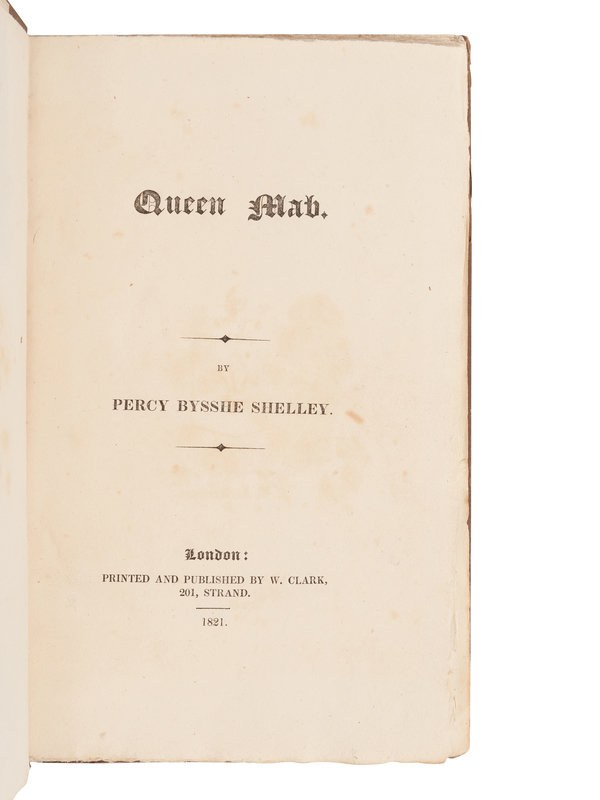 PIRATED FIRST EDITION, thin paper copy, issued without the dedication to Harriet *****, but this copy with the dedication leaf supplied and laid in (purportedly from a copy of the 1822 Carlile edition). Queen Mab was first privately printed in 1813. This pirated edition of 1821, printed by R. Clark, precedes the first authorized edition, which was composed of the remaining sheets from Clark's edition and issued with a new title-page by Carlile in 1822. When Shelley learned of Clark's unauthorized edition, he protested the piracy; Clark appeared before the Court of King's Bench on 23 June and pleaded not guilty to publishing an "indecent, immoral and scandalous poem." According to Geroge Goodspeed, "His trial did not take place until late in the following year, but the book appears to have been suppressed, nominally at least, very soon after its publication" (See The Colophon, New Graphic Series, No. 1, p.25-32, 1939). Ashley V., p.150. THE C.W. FREDERICKSON COPY.