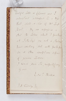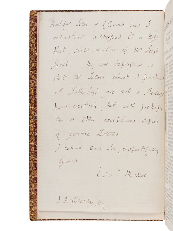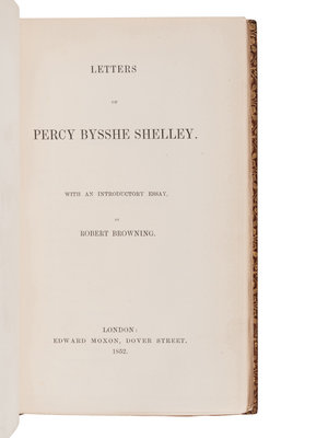 [Tipped in:] MOXON, Edward. Autograph letter signed to Coleridge, n.d. 2 pages, 8vo. Moxon discusses the manuscripts which served as the basis for this work: "The important fact respecting Letter 5 I will immediately communicate to Mr. Cunningham, the writer of the article in the Athenaeum. I may mention it is the decided opinion of Mr. Hookham, who knows more of Shelley's private history than any one else, that the whole of the letters are genuine. ...My own impression is that the letters which I purchased at Sotheby's are not in Shelley's hand writing, but with perhaps two or three exceptions copies of genuine letters."