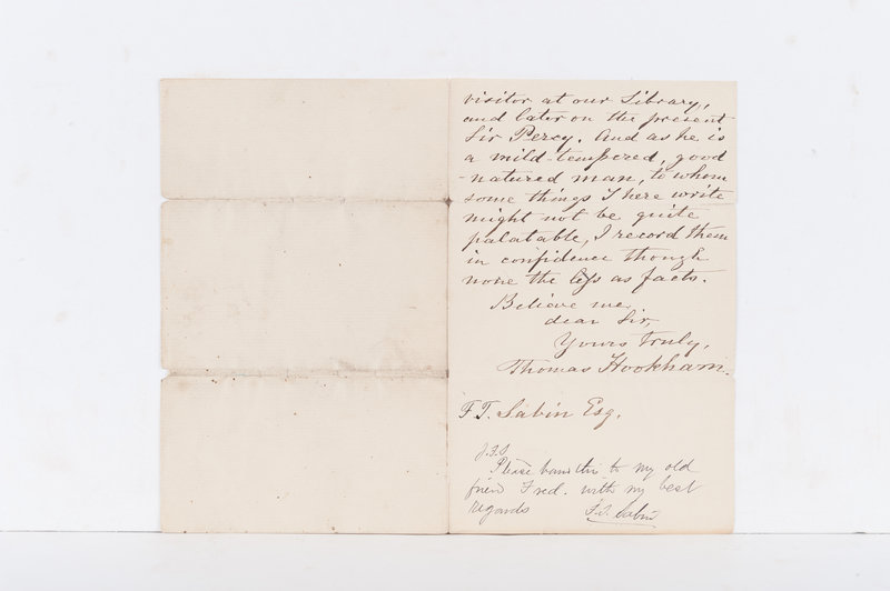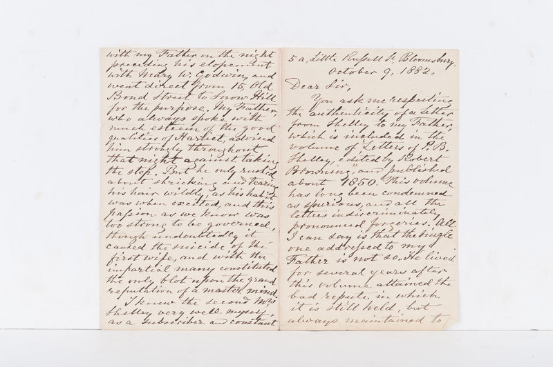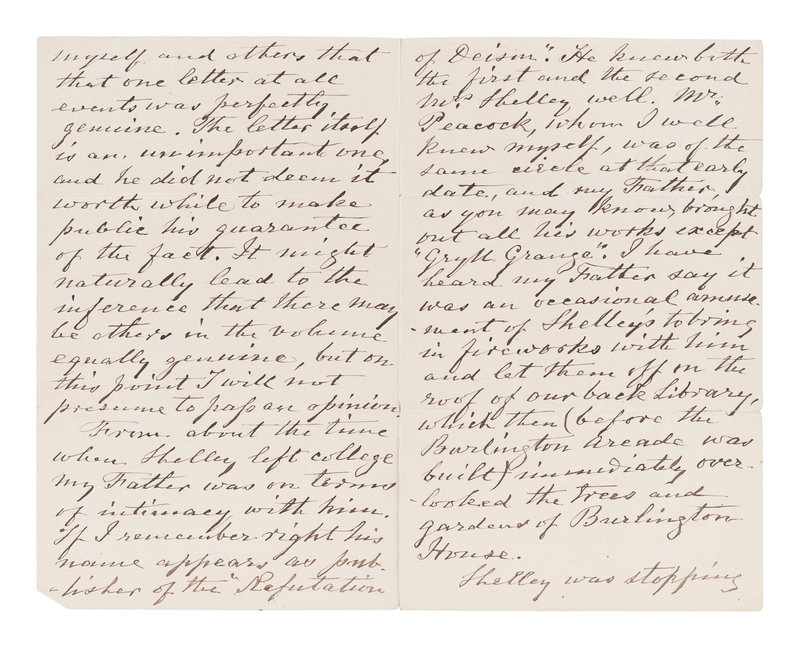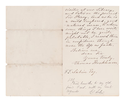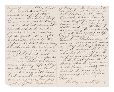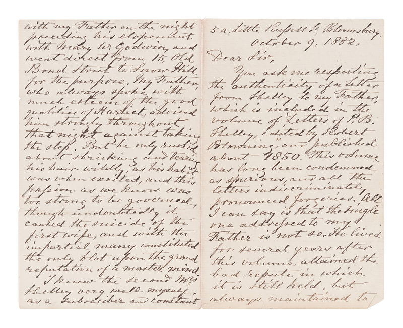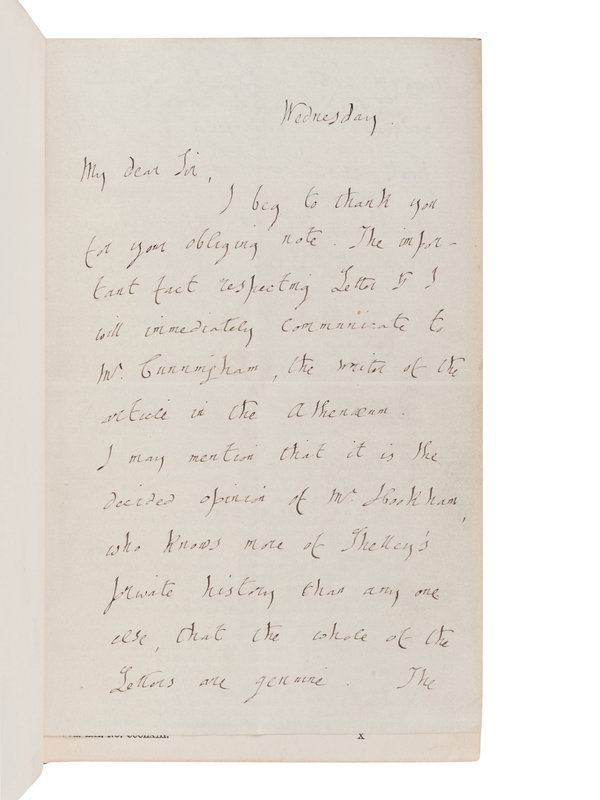 [Laid in:] HOOKHAM, Thomas. Autograph letter signed to Frank T. Sabin, 9 October 1882. With a post-script in Sabin's hand. 5pp., 8vo. "You ask me respecting the authenticity of a Letter from Shelley to my Father, which is included in the volume of 'Letters of P. B. Shelley, edited by Robert Browning,' and published about 1850. This volumes has long been condemned as spurious, and all the letters indiscriminately pronounced forgeries. All I can say is that the single one addressed to my Father is not so...The letter itself is an unimportant one, and he did not deem it worthwhile to make public his guarantee of the fact. It might naturally lead to the inference that there may be others in the volume equally genuine, but on this point I will not pressure to pass an opinion."