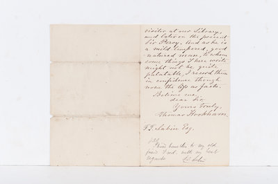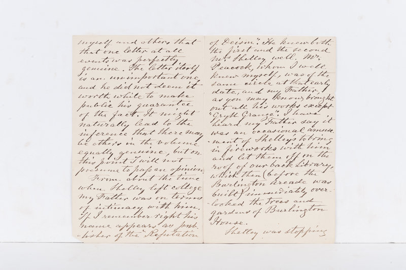 Two of the published letters include manuscript postscripts regarding the authenticity of those letters. On p.66, following Letter V, he writes: "This letter was printed in the Memoirs of Shelley...in the volume of Coleridge, Shelley & Keats...as early as 1833." In a note on p.145, following Letter XXI, he notes the specific passages in the letter which led to the doubt of the volume as a whole.
