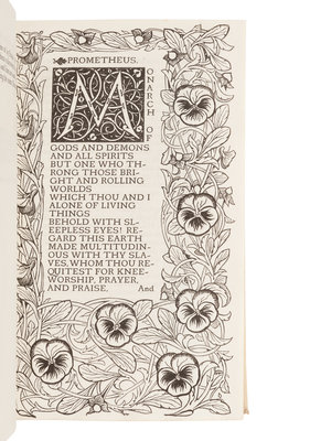 3 volumes, 8vo. Wood-engraved pansy border by C. Keats after Charles Ricketts at text opening of each volume, woodcut initials by Ricketts. (Some very minor mostly marginal spotting to a few leaves.) Original white buckram, uncut and unopened (some very minor spotting or soiling, fore-edge of vols. I & II slightly bumped). Provenance: Shepard Book Company (bookseller's label); Louis V. Ledoux (1880-1948), American poet, George Edward Woodberry scholar, Japanese print collector (engraved bookplate).