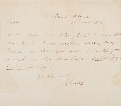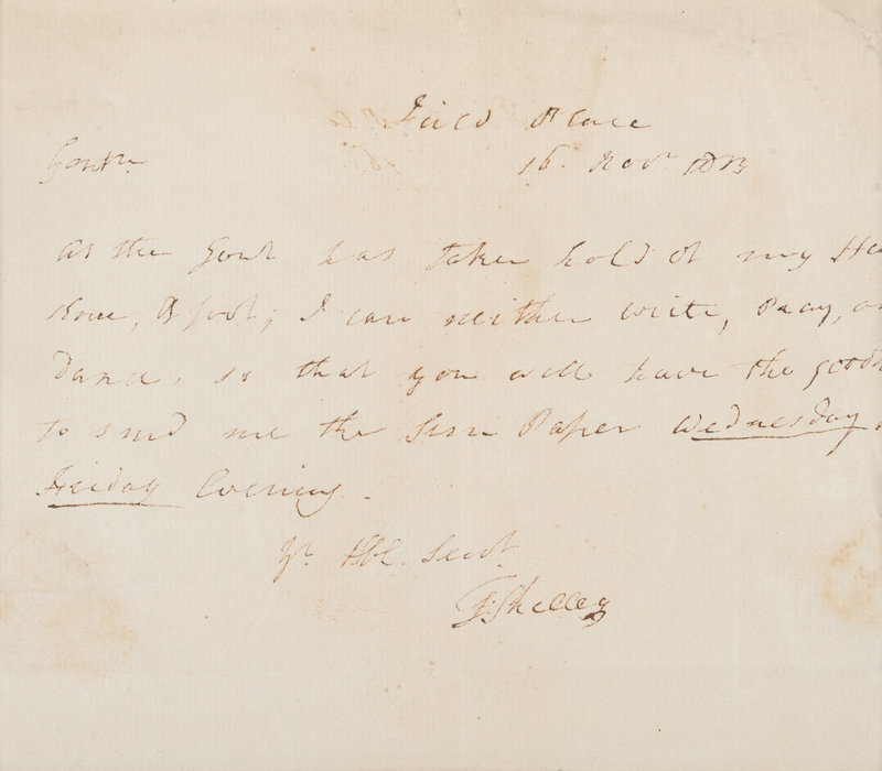 Capt. E. S. Trelawny, ALS, 8vo, 1841 -- J. Shelley, ALS, 4to, 1799 -- Augusta Leigh (sister of Lord Byron), AL, 3p., 8vo -- Peter Finnerty, ALS, 4to, 1804 -- T. Shelley, 2 ALSs, 1813 and 1828 -- Edward Dowden, ALS, 4pp., 8vo, 1885, regarding his Life of Shelley -- Lady J. S. Shelley, ALS, 2pp., 8vo -- Sir Percy F. Shelley, ALS, 8vo, 1883 -- J. C. Jeaffreson, ALS, 4pp., 8vo, 1883 -- Edward Moxon, ALS, 2pp., 8vo, 1867 -- H. Buxton Forman, ALS, 3pp., 8vo, 1876, regarding Shelley's letters -- Joseph Severn, ALS, 3pp, 8vo -- Charles Cowden Clarke, ALS, 4pp., 8vo, 1842 -- T. F. Dillon Croker, 2 ALSs, 8vo, 1854 -- Prof. C. Short, MS, Oration on Shelley.