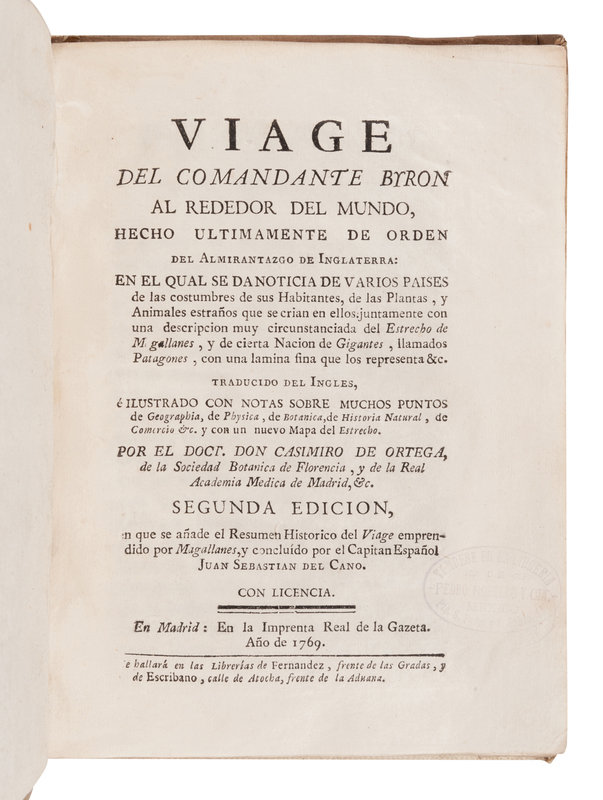 Second edition of Casimiro Gómez de Ortega’s Spanish translation of John Byron’s A Voyage Round the World, in His Majesty's Ship The Dolphin, Commanded by the Honourable Commodore Byron (1767). Ortega was a botanist at the Royal Botanical Garden of Madrid and identified plant species collected during Spanish expeditions to the Americas in the 18th century.