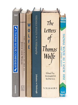 FISHER, Vardis. Thomas Wolfe As I Knew Him. Denver: Alan Sallow, 1936. -- Johnston, Carol. Thomas Wolfe. A Descriptive Bibliography. Pittsburgh: University of Pittsburgh Press, 1987. -- Preston, George R. Thomas Wolfe. A Bibliography. New York: Charles S. Boesen, 1943. Inscribed by the publisher, Charles S. Boesen. -- HARPER, Margaret Mills. The Aristocracy of Art in Joyce and Wolfe. Baton Rouge and London: Louisiana State University Press, 1990. -- IDOL, John Lane. A Thomas Wolfe Companion. New York: Greenwood Press, 1987. INSCRIBED BY IDOL, 1994. -- NOWELL, Elizabeth. The Letters of Thomas Wolfe. New York: Charles Scribner’s Sons, 1956. Dust jacket (price-clipped). -- And approximately 130 others. Together, approximately 138 volumes, 8vo, all in original publisher’s cloth, cloth-backed boards, printed boards, or printed wrappers, with dust jackets where indicated, condition generally fine. Complete list available on request.