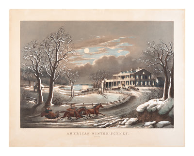 American Winter Scenes. Evening, 1854. (G. 0221). Large format lithograph with hand-coloring heightened in gum arabic, on wove paper, matted and framed, 549 x 701 mm sheet. Some minor toning from old matting, a few pale spots or stains, short closed tear upper margin, some staining verso from old framing, surface scratch verso, old pencil annotations verso.