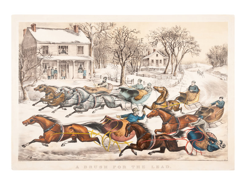 A Brush for the Lead [New York Flyers on the Snow], 1867. (G. 0795). Large format lithograph with hand coloring heightened in gum arabic, on wove paper, 550 x 794 mm sheet. Subtitle in lower margin trimmed away, small loss to lower left corner repaired verso, some minor mostly marginal soiling, very light staining verso, tiny pencil annotation in lower corner. VERY RARE: According to online records, only one example of this print has sold at auction in the last 60 years.