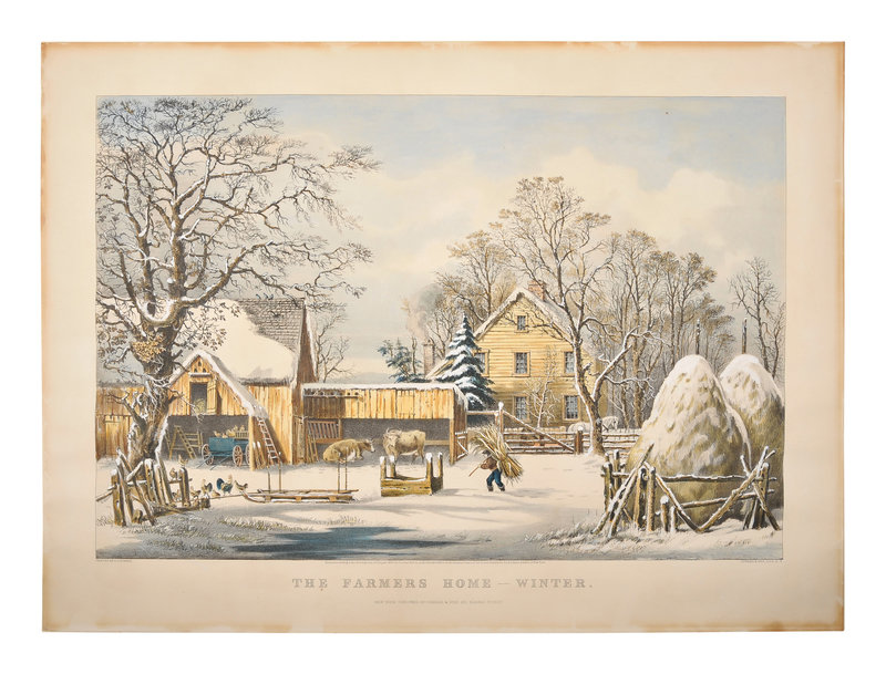 The Farmers Home - Winter, 1863. (G. 2048). Large format lithograph with hand-coloring heightened in gum arabic, on wove paper, matted and framed, 520 x 706 mm sheet. 3/4-in. closed tear lower margin, 1/4-in tear lower margin repaired verso, some mostly marginal soiling, minor toning verso, old pencil annotation verso. RARE: according to online records, only one example of this print has sold at auction in the last 80 years.