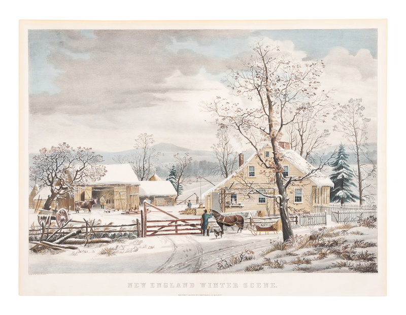 New England Winter Scene, 1861. (G. 4801). Large format lithograph with hand-coloring heightened in gum arabic, on wove paper, matted and framed, 493 x 652 mm sheet. Some toning from old matting, a few faint graphite marks to outer margin from old framing, old pencil annotation verso.