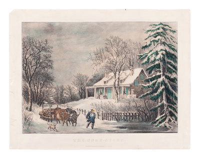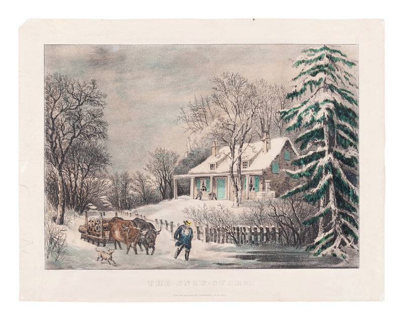The Snow-Storm, ca 1860. (G. 5978). Medium format lithograph with hand-coloring heightened in gum arabic, on wove paper, matted and framed, 352 x 453 mm sheet. Some minor surface abrasions occasionally affecting outer margins of image with minor inpainting, a few short marginal tears, small portion of upper left corner torn away, some light staining and a few pencil annotations verso.