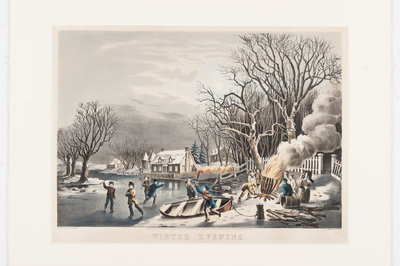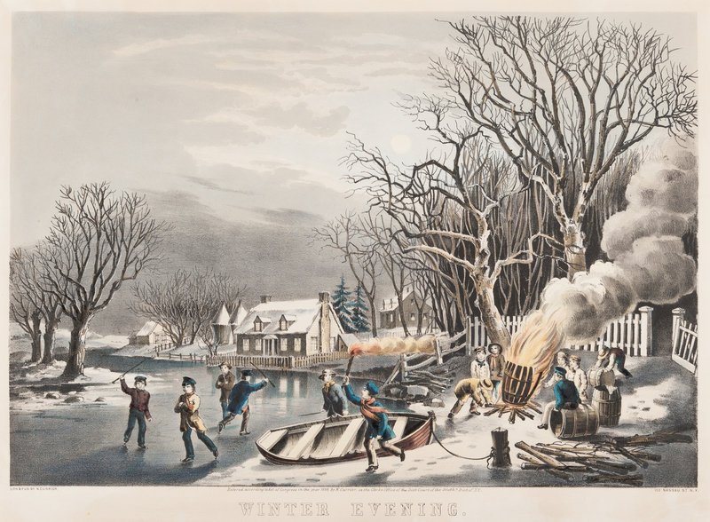 Winter Evening, 1854. (G. 7271). Medium format lithograph with hand-coloring heightened in gum arabic, on wove paper, matted and framed, 304 x 404 mm sheet. Some minor marginal toning from old matting, a few minor surface stains lower margin, tiny chip lower left corner, some soiling verso, tiny pencil annotation verso.