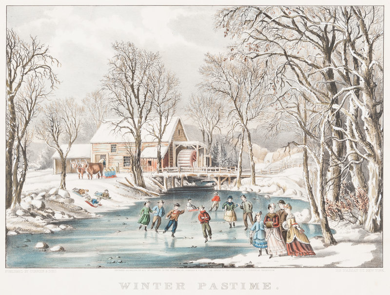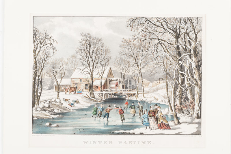 Winter Pastime, 1855. (G. 7281). Medium format lithograph with hand-coloring heightened in gum arabic, on wove paper, matted and framed, 356 x 428 mm sheet. Slight chipping with minor losses to two corners, marginal toning from old framing, 1-in. tear just touching border left margin, some slight mostly marginal spotting or staining, some soiling and a few old pencil annotations verso.