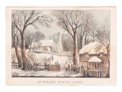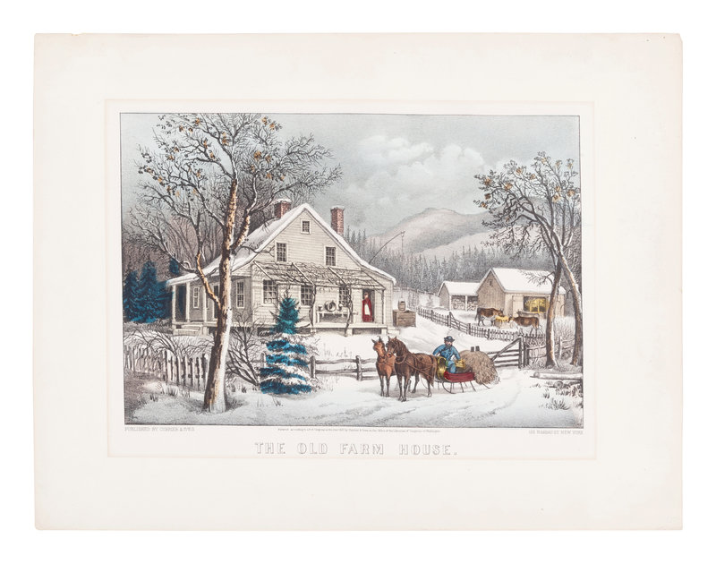 An English Winter Scene, n.d. (G. 1890). -- The Old Farm House, 1872. (G. 4494). -- 2 small-format lithographs with hand-coloring heightened in gum arabic on wove paper, 342 x 445 mm sheet or smaller, matted and framed, some minor toning or mat burn.