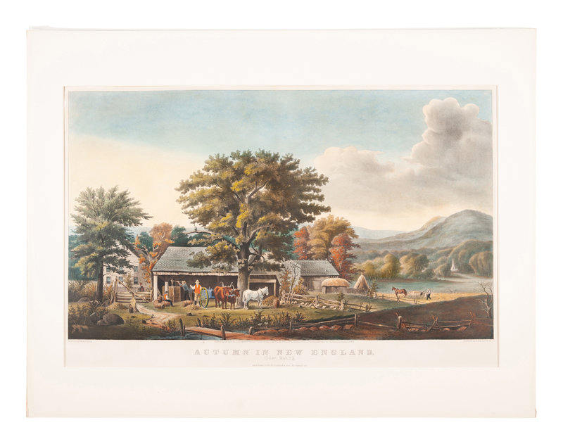 Autumn in New England. Cider Making, 1866. (G. 0350). Large format lithograph with hand-coloring heightened in gum arabic, on wove paper, matted and framed, 180 x 708 mm sheet. A few pale mostly marginal stains or tiny spots, some staining verso from old framing, tiny chip to left outer margin, discreet dealer pencil annotation recto. Provenance: L. F. Bull (near-contemporary signature verso).
