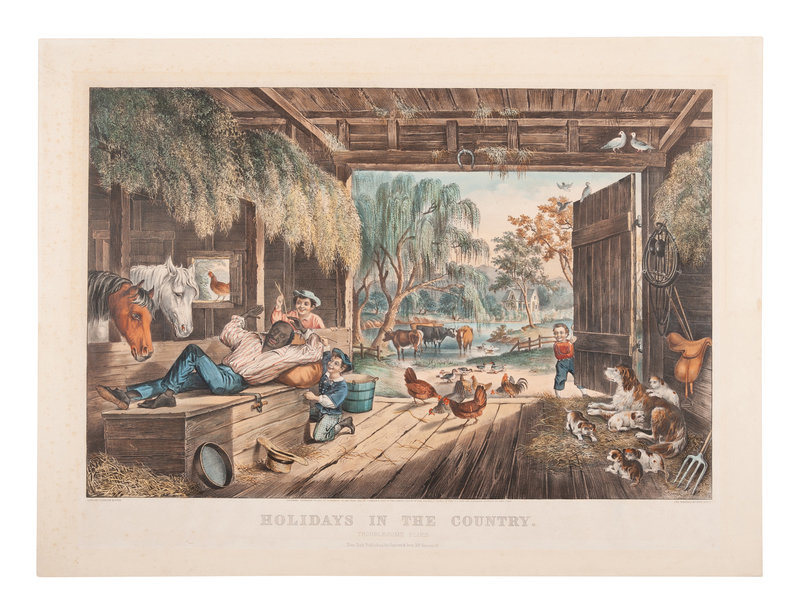 Holidays in the Country. Troublesome Flies, 1868. (G.). Large format lithograph with hand-coloring heightened in gum arabic, on wove paper, matted and framed, 520 x 697 mm sheet. Some minor mostly marginal spotting, some toning from old matting, dampstained verso not affecting image, old dealer pencil annotation verso. RARE: According to online records, only 2 examples of this print have sold at auction in the last 75 years.