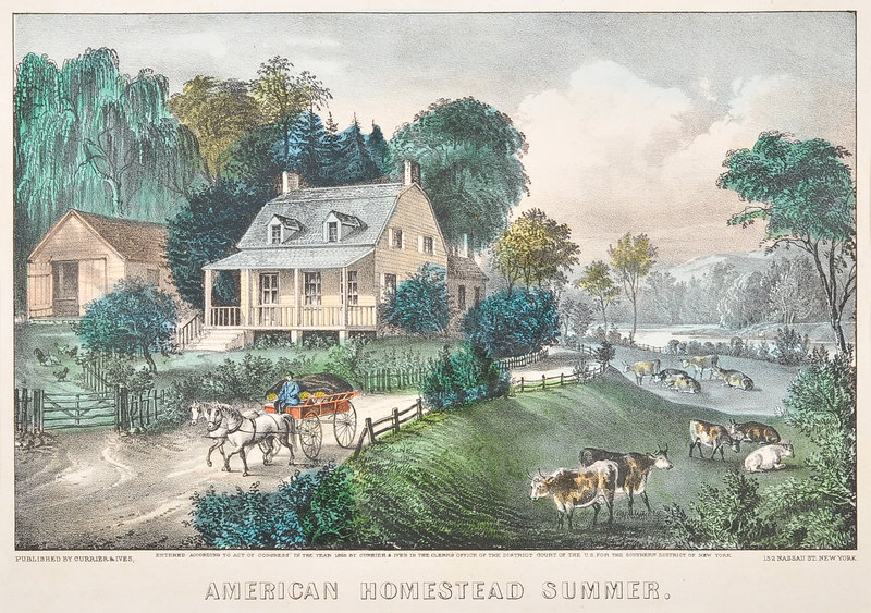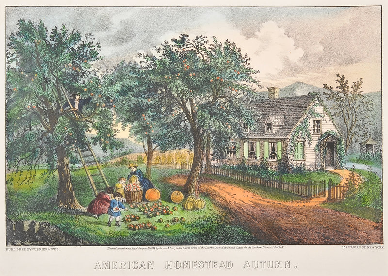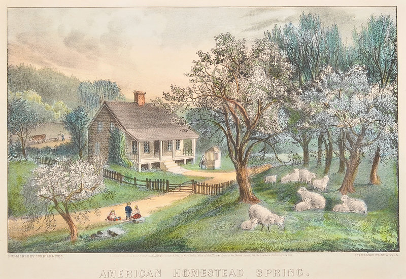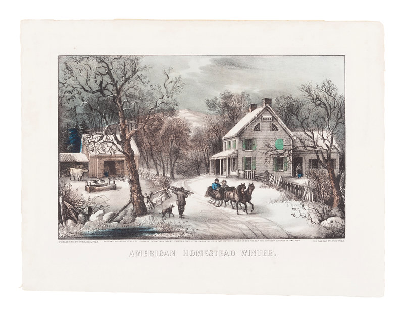 American Homestead Autumn, 1869. (G. 0181). -- American Homestead Spring, 1869. (G. 0183). -- American Homestead Summer, 1868. (G. 0184) -- American Homestead Winter, 1868. (G. 0185). -- 4 small format lithographs with hand coloring heightened in gum arabic on wove paper, 320 x 403 mm or smaller, some minor mostly marginal toning