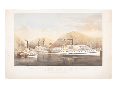 American Steamboats on the Hudson. Passing the Highlands, 1874. (G. 0210). Large format lithograph with hand-coloring heightened in gum arabic, on wove paper, 643 x 1012 mm sheet. Small hole in left margin repaired verso, some minor surface abrasions to margins, some minor mostly marginal soiling, a few very short marginal tears, some minor soiling verso, a few small pencil annotations recto and verso. RARE: According to online records, no example of this print has sold at auction in the last 70 years.