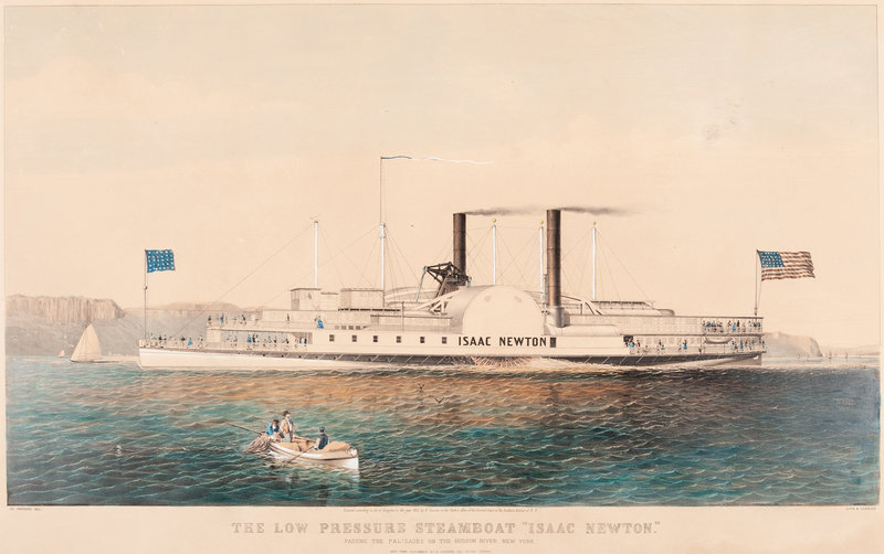 The Low Pressure Steamboat "Isaac Newton." Passing the Palisades on the Hudson River New York, 1855. (G. 4148). Large format lithograph with hand-coloring heightened in gum arabic, on wove paper, matted and framed, 504 x 786 mm sheet. Some minor chipping or tears with small losses to corners and upper margin, a few short tears along top margin including one just entering image, some overall toning, some staining verso from old framing. VERY RARE: According to online records, no example of this print has sold at auction in over 70 years.