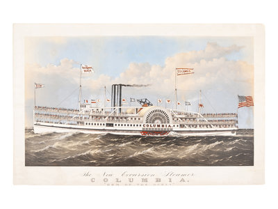 The New Excursion Steamer Columbia. "Gem of the Ocean", 1877. (G. 4802). Large format lithograph with hand-coloring heightened in gum arabic, on wove paper, 610 x 963 mm sheet. Backed with Japanese tissue, bottom margin trimmed just shaving title and with loss of additional text line "The Largest Steamboat...", 2-in. tear with loss to blank lower left margin repaired recto, 2 1/2-in tear left margin crossing image with some minor retouching, some very minor spotting or soiling. RARE: According to online records, only one example of this print has sold at auction in the last 90 years.