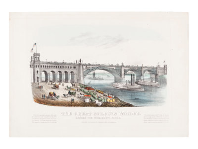 The Great St. Louis Bridge. Across the Mississippi River, n.d. (G. 2872). Small format lithograph with hand-coloring heightened in gum arabic, on wove paper, matted and framed, 314 x 450 mm sheet. Some minor marginal toning from old matting, tiny hole to outer margin upper left corner, a few tiny pale mostly marginal spots.