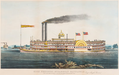 High Pressure Steamboat Mayflower. Capt. Joseph Brown. First Class Packet between St. Louis and New Orleans on the Mississippi River, 1855. (G. 3052). Large format lithograph with hand-coloring heightened in gum arabic, on wove paper, matted and framed, 590 x 830 mm sheet. A few surface abrasions to sheet edge left side, a few tiny spots in image, very minor toning from matting, a few short tears upper margin, some very slight toning or spotting from old framing verso, discreet dealer pencil annotations recto and verso. VERY RARE: Only one example of this print has sold at auction in the last 60 years.