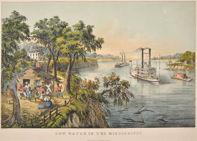 Low Water in the Mississippi, 1868. (G. 4149). Large format lithograph with hand-coloring heightened in gum arabic, on wove paper, matted and framed, 579 x 831 mm sheet. Backed with japan tissue, a few minor marginal surface abrasions, discreet booksellers pencil annotations lower margin recto.